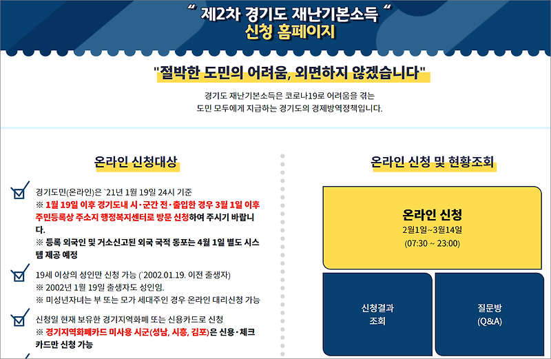 경기도 2차 재난지원금의 지급대상은 경기도민 누구나 가능하지만 2021년 1월 19일 24시 기준 으로 경기도에 주소를 둔 경기도 주민이어야 합니다.